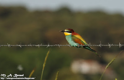 In this post I´m going to write about a bird in the nature of Salamanca: the Bee – eater. This medium sized bird is a summer visitor, with an exotically rich and gaudy plumaje colours. It selects a huge variety of habitats for breeding in warm areas: cultivated farmlands or in broken, open terrain with pastureland, bushes, odd treeps or copses, often in our area by rivers with steep Banks, but also commonly in sand pits.