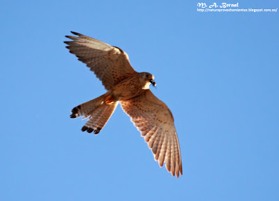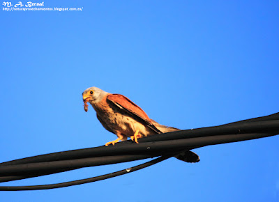 Cernícalo primilla(Falco naumanni), con insecto en el pico.