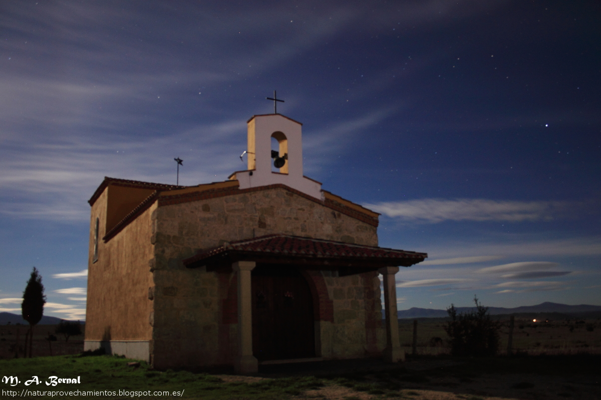 Ermita de la Virgen de la Peña de Francia de noche, un día con nubes y luna llena.