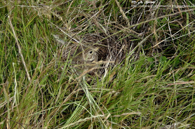 También las aves, se dedican a preparar sus nidos, la puesta y a criar a su prole. Aquí vemos una alondra incubando su nido.