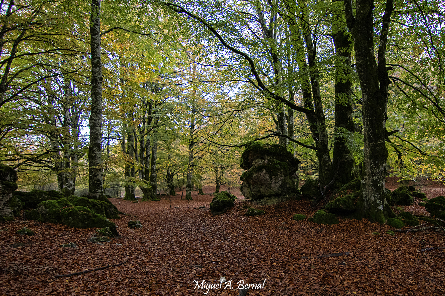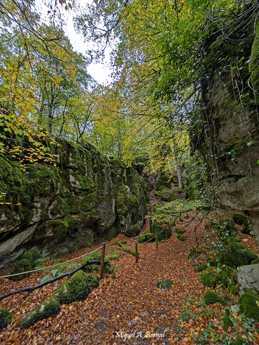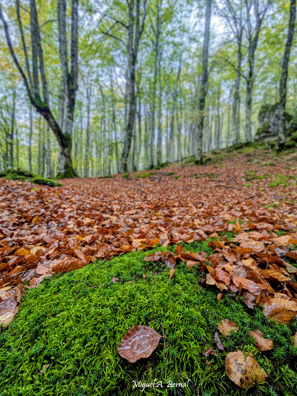 Es un verdadero bosque de cuento: hayas centenarias que en pleno otoño explotan en una paleta infinita de rojos intensos, naranjas fuego, amarillos dorados y verdes residuales. Las rocas kársticas cubiertas de musgo esmeralda emergen como guardianes antiguos, con ramas y raíces retorcidas que las abrazan creando formas fantásticas que sorprenderán al visitante.