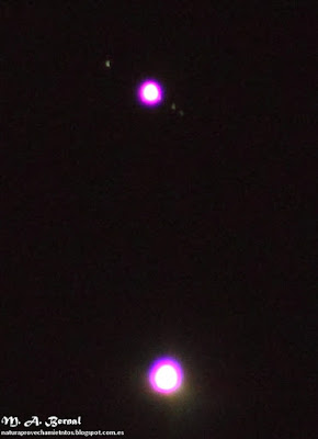 A continuación una imagen de Venus y Júpiter, en la que se aprecia el primero en la parte de abajo más brillante, debido a su cercanía a la tierra y el segundo en la parte de arriba rodeado de sus cuatro satélites galileanos, muy interesante esta conjunción que con un telescopio o con unos prismáticos de cierta calidad se ha podido apreciar durante estos días.