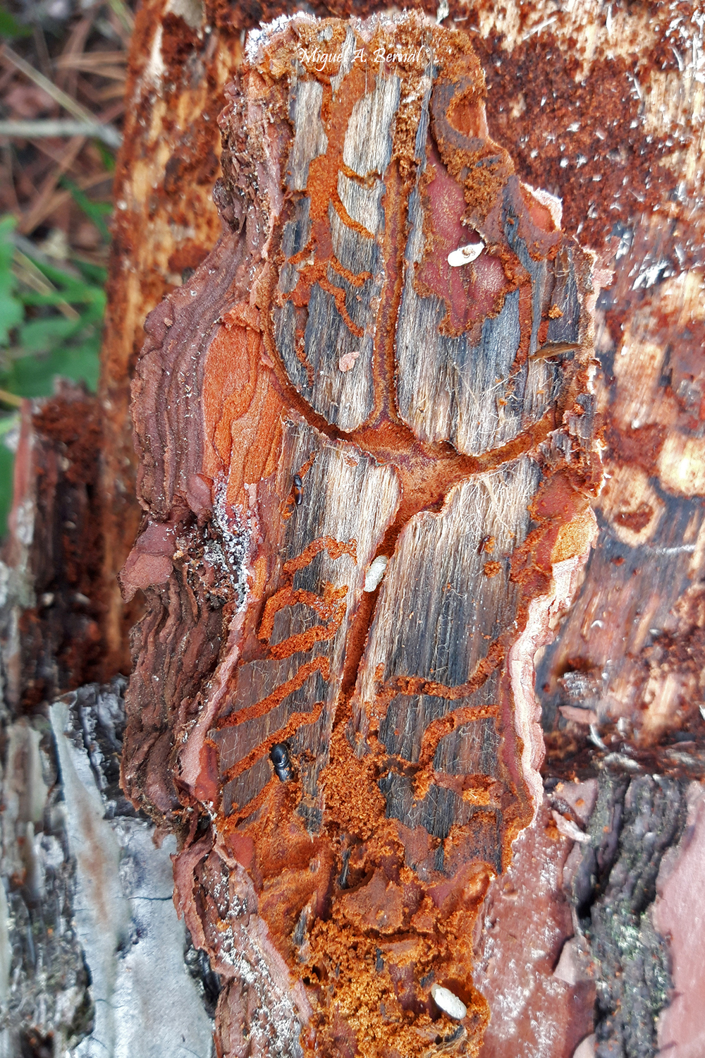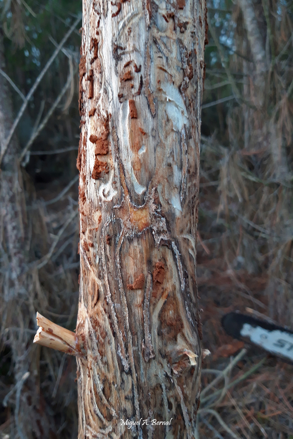 Las larvas se alimentan del floema, generando galerías características en forma estrellada o radial, que interrumpen el flujo de savia. El resultado: debilitamiento progresivo y, en muchos casos, la muerte del pino.