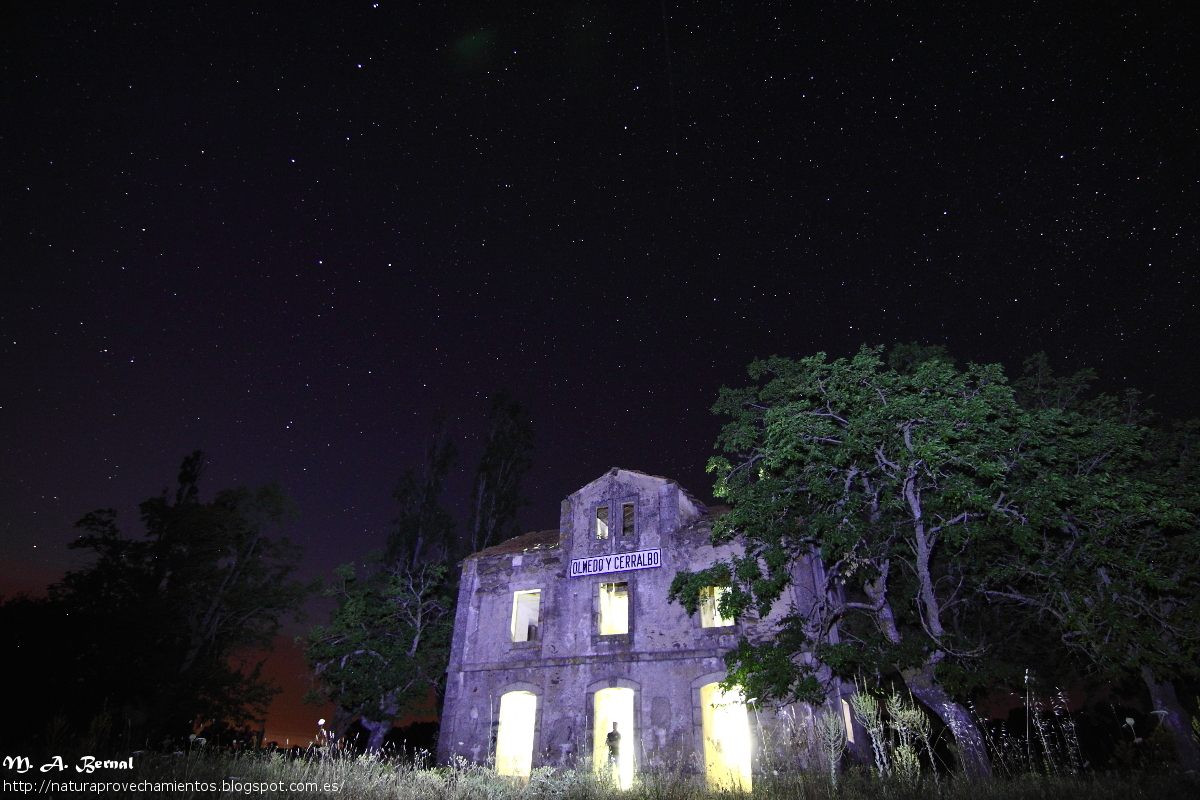 Teníamos una noche con luna creciente al 22% que se puso a las 00:01, hora justo a la que comenzaba la noche cerrada, por ello fuimos a una hora prudencial con el fin de preparar el escenario. Comenzamos con fotografías de estrellas aportando cierta iluminación al edificio, tanto con focos como con flashes.